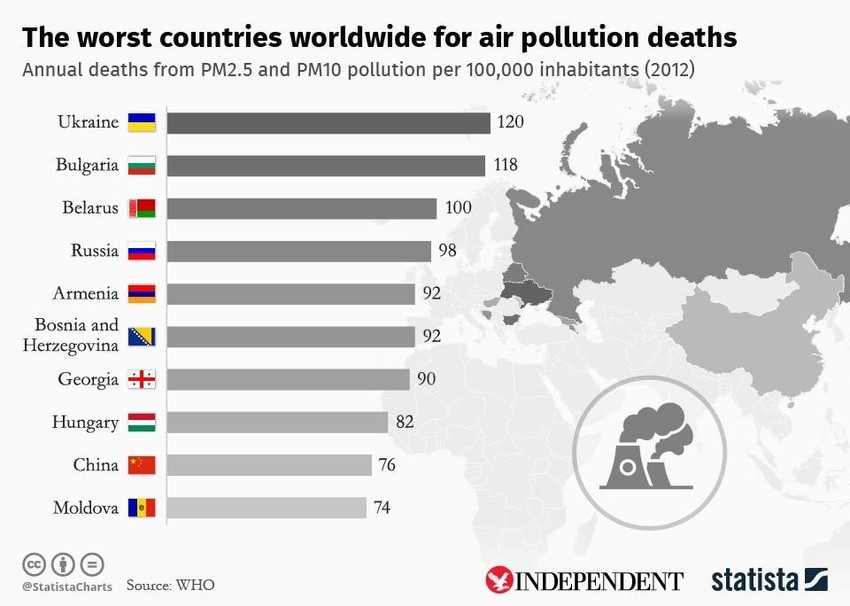 4. 92% of the deaths linked to polluted air occurred in middle or low-income countries. Hence, parts of Africa, India, Eastern Europe, the Middle East and China are dangerous spots. The highest deaths were recorded in Eastern Europe. The chart below details this information.